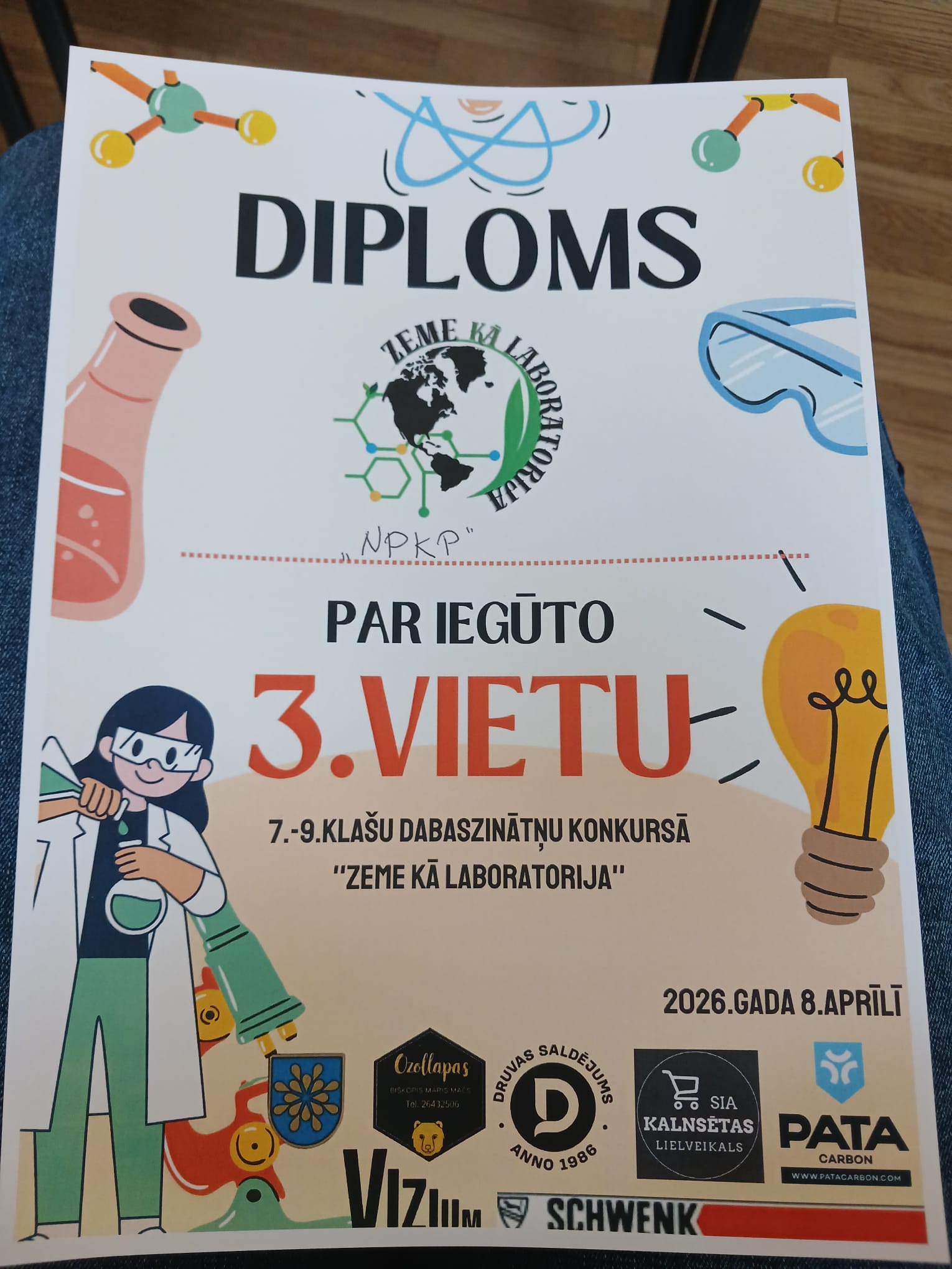 Trešdien, 8. martā, Saldus vidusskolā notika Dabas zinātņu konkurss ‘Zeme kā laboratorija” 7. – 9. klašu skolēniem. Mūsu skolu pārstāvēja 9. klases skolniece Antra Viežauska, 8. klases skolnieks Renārs Bors, 7. klases skolniece Aiva Hofšteitere. Tur mums bija jājiet 10 stacijās . Pirmajā stacijā bija jāatpazīst dzīvnieku galvaskausi. Otrajā stacijā bija jāzina bīstamības zīmes. Trešajā stacijā bija jāzina mikroskopa daļas. Ceturtajā stacijā bijā jāatpazīst ievārījumi. Piektajā stacijā bija jāzina orgāni un to latīniskie nosaukumi. Sestajā stacijā bija jāzina cilvēka skelets. Septītajā stacijā bija jāzina ko drīkst liet notekcaurulēs. Astotajā stacijā bija jāzina klimata joslas un kuras valstis tajās atrodas. Devītajā stacijā bija jāzina auga audi un to iedalījumi. Desmitajā stacijā bija jāzina par atkritumu šķirošanu un vienpadsmitajā stacijā bija jāparāda savas zināšanas pirmajā palīdzībā. Mūsu skolas komanda ieguva 3. vietu no 11 komandām un ieguvām pat foršas un gardas balvas!